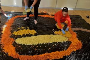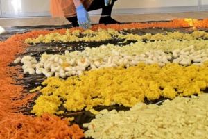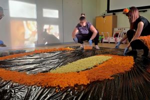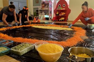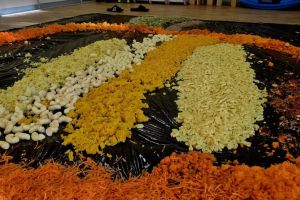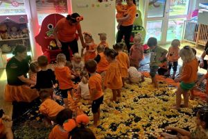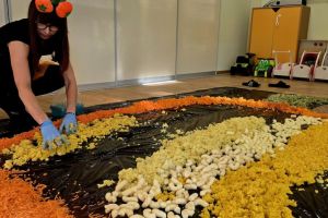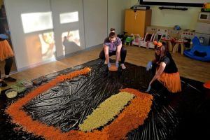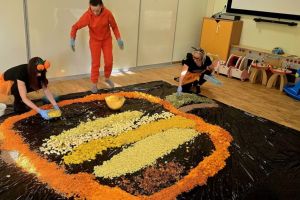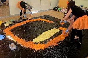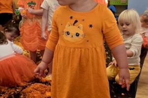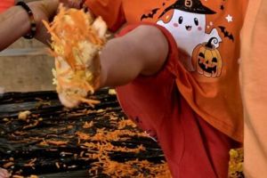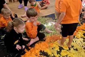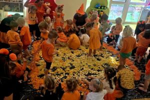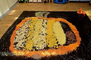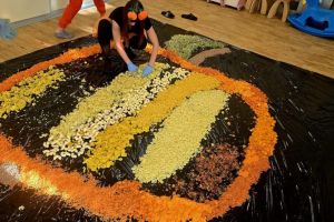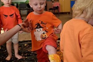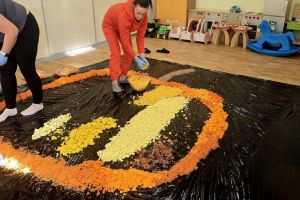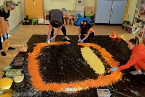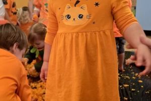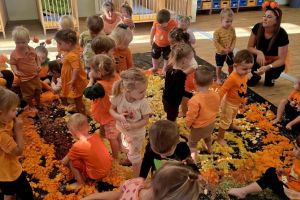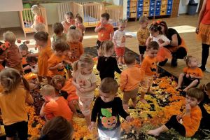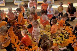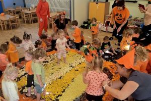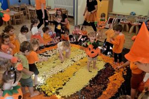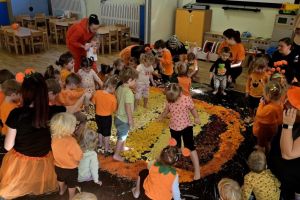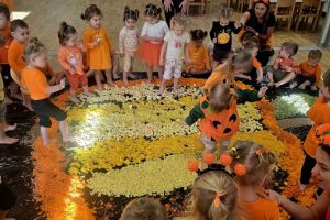 Z artykułów spożywczych min. makaronu, ryżu, ziemniaków itp. została wykonana kolorowa dynia. Poprzez zabawę sensoryczną dzieci pobudzały zmysł dotyku, smaku i węchu.